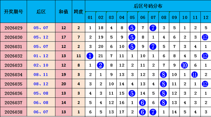 后区第二位:前10期开出奖号:其中奇数号码开出4次,偶数号码开出6次,奇偶走势偶数胜出,本期注意奇数号码出现。参考号码:11。